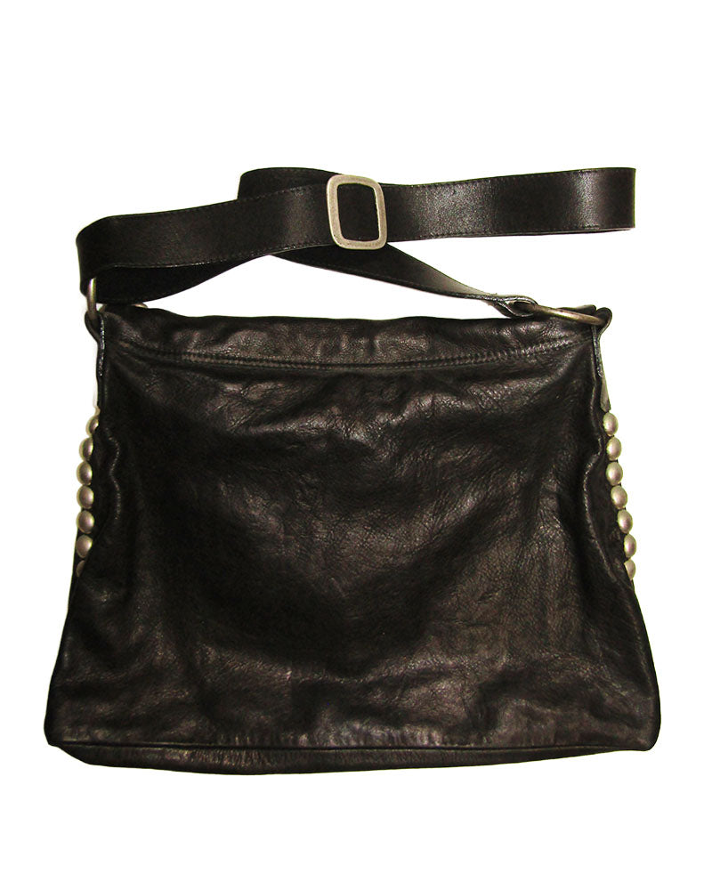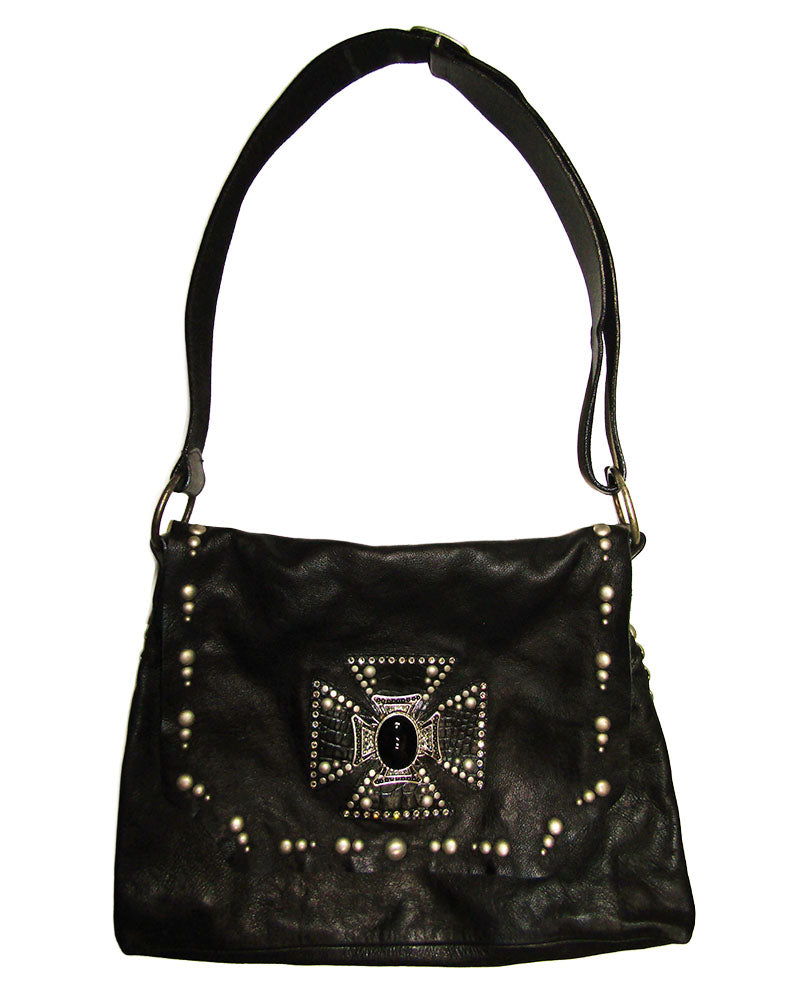 A cool gothic cross ornament set on top of printed leather overlays, covered in glittering crystals and a center gemstone on the flap of this roomy messenger bag made of buttery soft leather. Pearl studs line the flap and sides to finish the look!