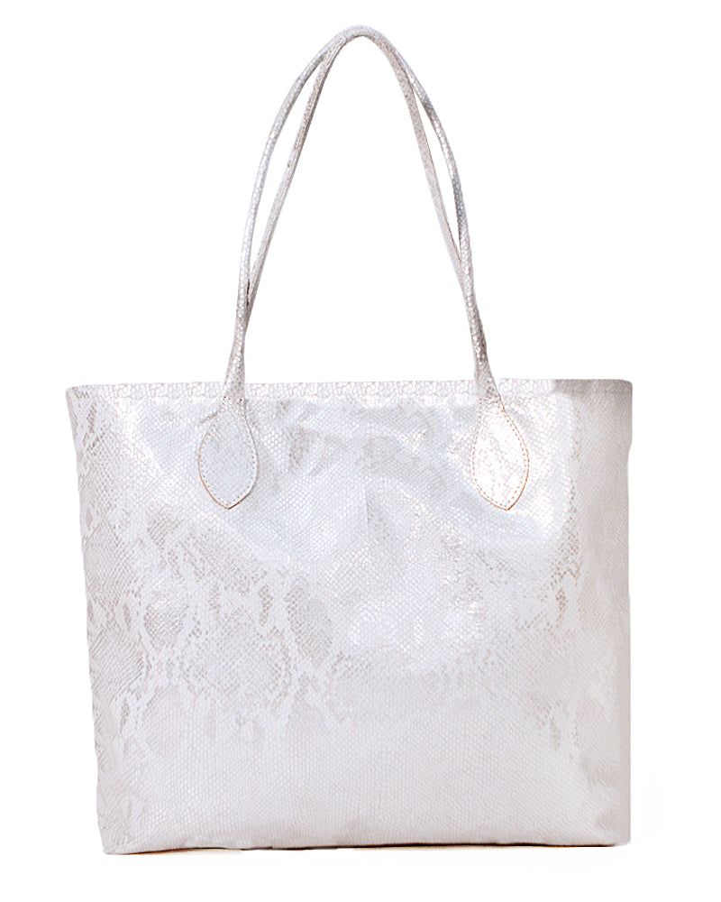 This roomy tote bag is made with gorgeous silver and white boa-printed leather, in a clean and classic style.