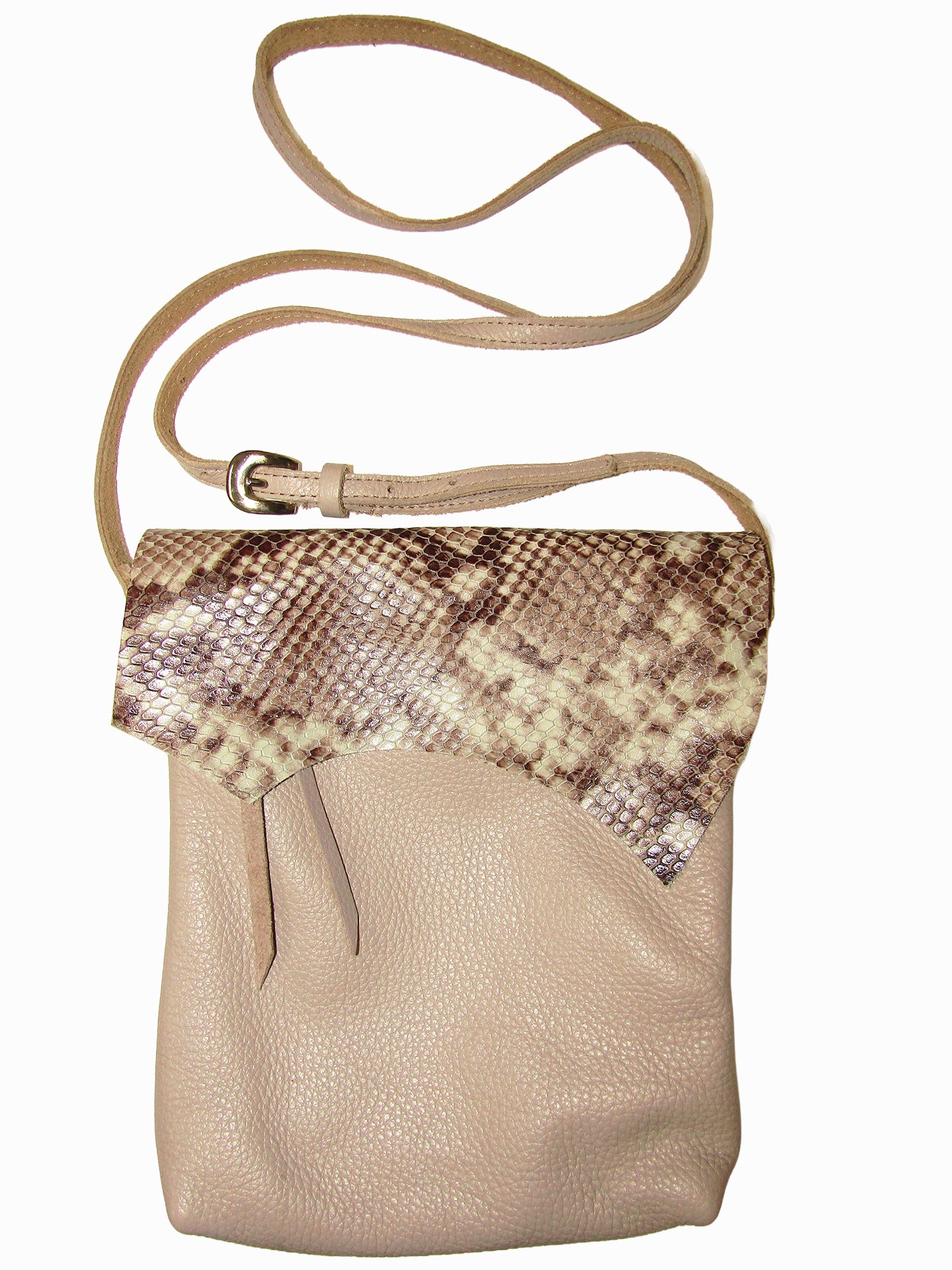 An asymmetrical python-embossed leather flap brings a fun flair to this rectangular crossbody bag in a Taupe Beige leather.