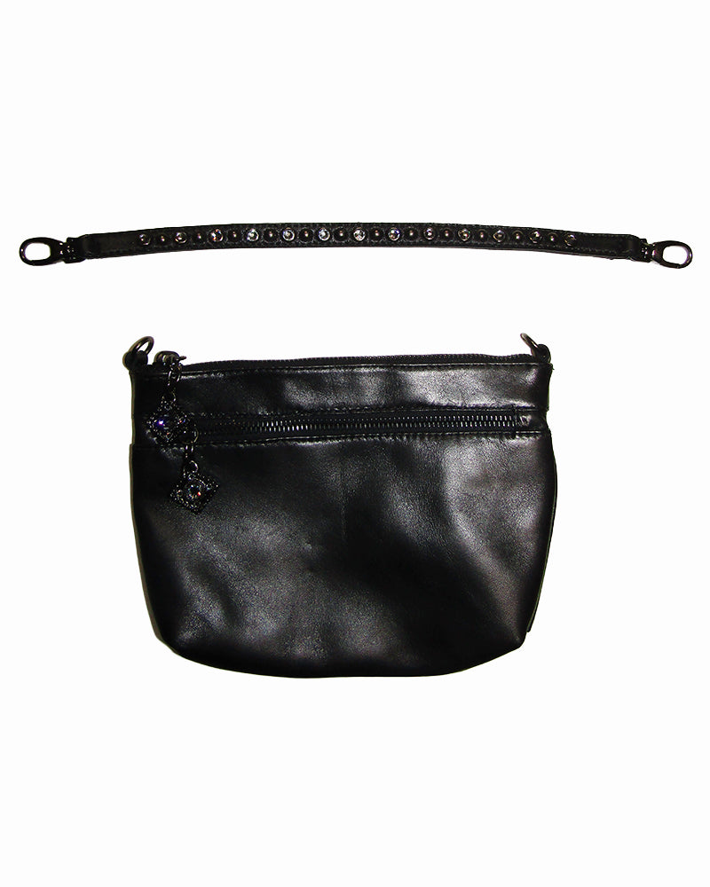 Black Smooth leather forms this clutch, finished with a studded crystal strap that can be worn as a clutch, wristlet, or on the shoulder.