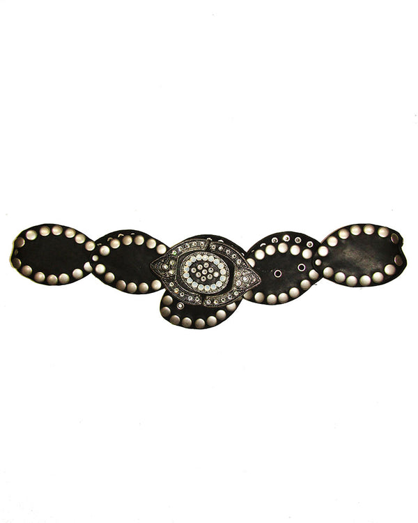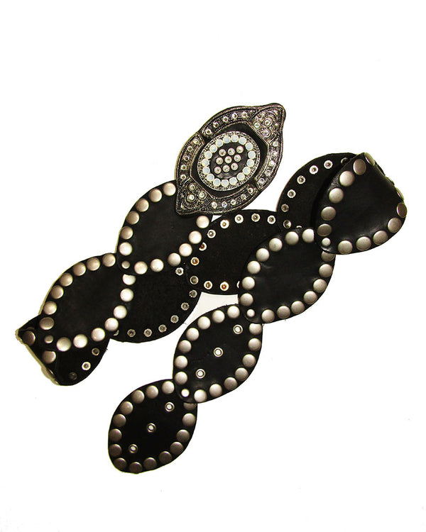 This showstopping studded belt will look fabulous low on the hips perfect for any mini or long skirt. 2.75" W at widest point 1.5" width Genuine Leather Finest European Crystals Made in the USA *Vintage Sample, early 2000's