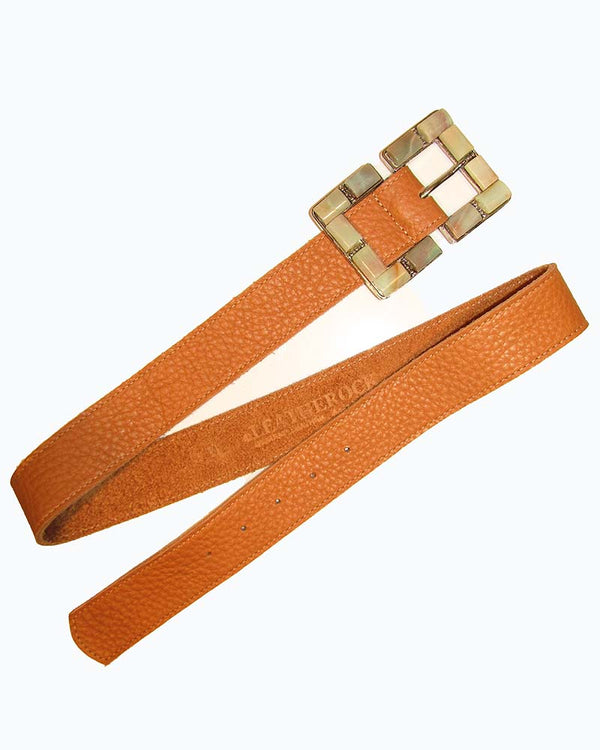 A geometrical buckle set with Amazonite semi-precious stones on a pebbled Tan colored strap. 1.5"W Strap 4"x 2.75" Buckle Genuine Leather Semi-Precious stones Made in the USA