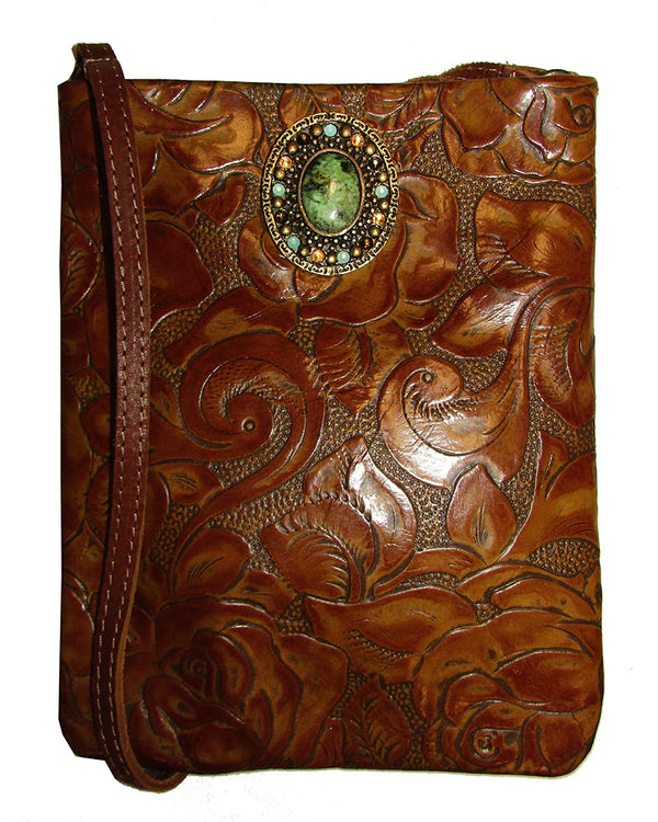 An oval ornament with sparkling crystals and a semiprecious cabochon sits on gorgeous floral embossed leather, lending a slight Western mood. 8.25"x6.5" Magnetic snap closure Zippered pocket on back Leather crossbody strap Genuine Leather Austrian Crystals African Turquoise Cabochon Made in the USA...