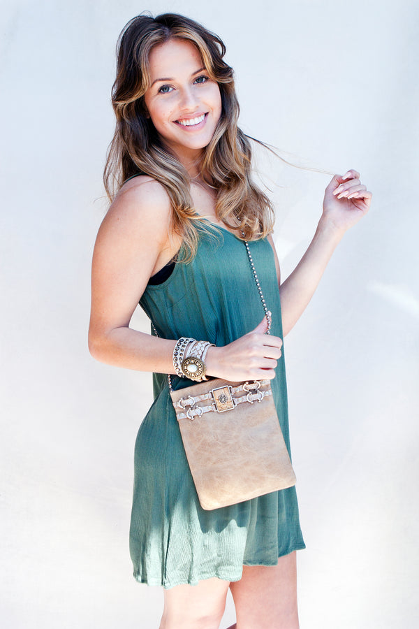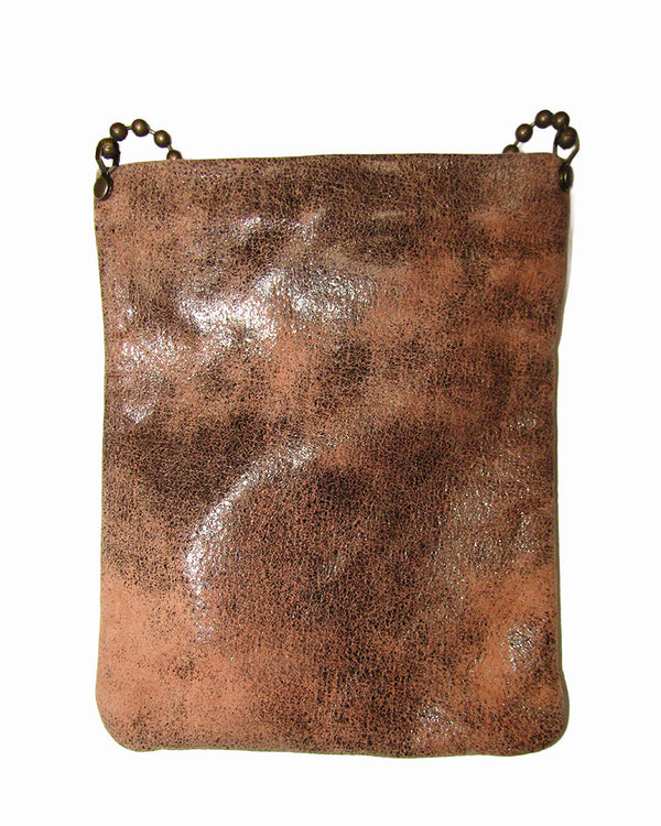 This small but versatile cell phone pouch is accented with a beautiful stone and antiqued hardware details. A zippered pocket on the back adds storage room. 6.75"x8.5" Magnetic snap closure Ball & chain strap with leather shoulder cover Genuine Leather...
