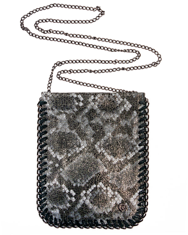 Hematite chain is laced with black leather to add some attitude to this cell phone pouch, made in a charcoal snake-print leather.  7.75"Lx6"W Magnetic snap closure Chain crossbody strap Genuine Leather Made in the USA