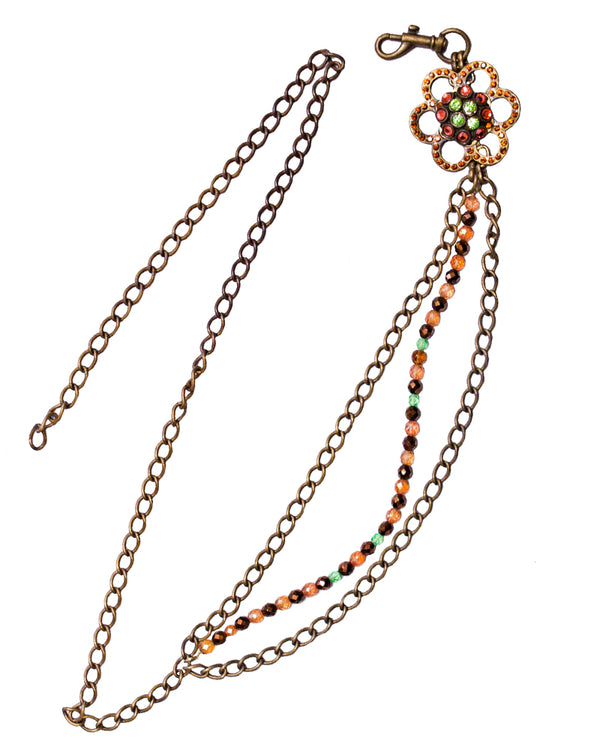 Layers of brass chain and beads meet a cute flower ornament at the end of this vintage style.  Vintage Sample - Sold AS IS. Slightly tarnished.  One Size Adjustable - TOTAL LENGTH 43" 2.25" at widest Austrian Crystals Made in...