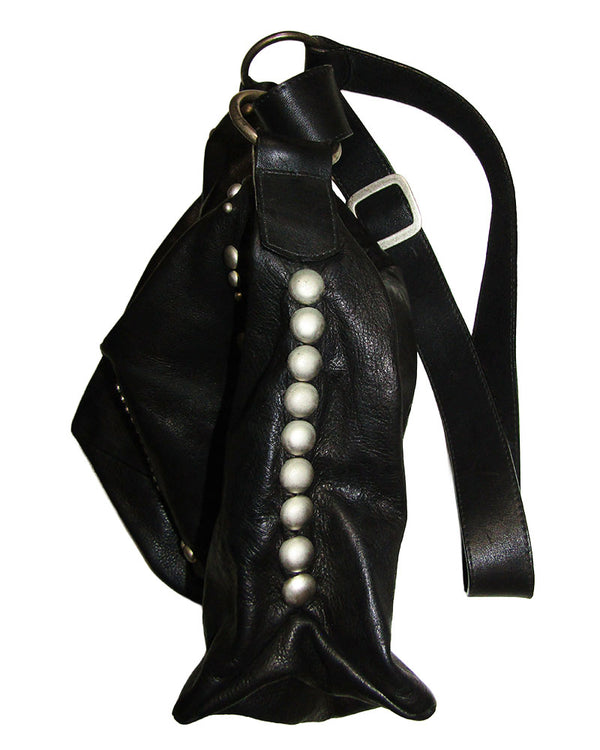 A cool gothic cross ornament set on top of printed leather overlays, covered in glittering crystals and a center gemstone on the flap of this roomy messenger bag made of buttery soft leather. Pearl studs line the flap and sides...