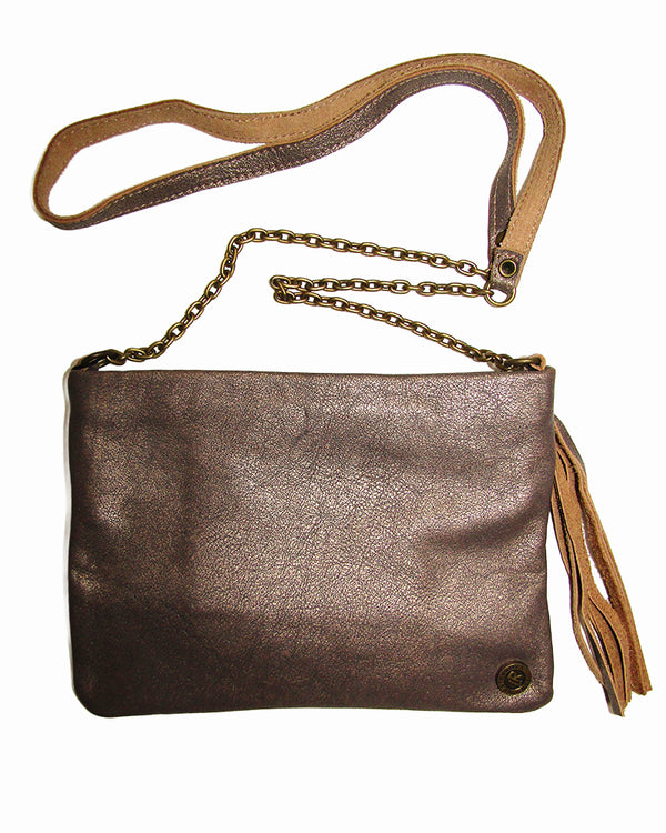 Glittering crystals and a glass stone sit as the centerpiece to this classic bag shape. Leather lacing adds a rustic touch. 8.5"x6.5" 28" strap drop Chain/Leather strap Zippered closure Interior credit card pockets Genuine Leather Austrian Crystals Made in the...