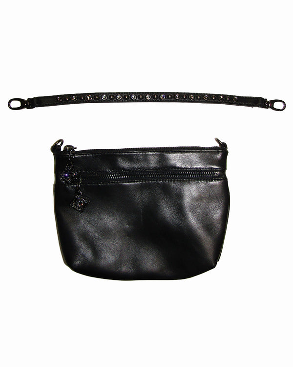 Black Smooth leather forms this clutch, finished with a studded crystal strap that can be worn as a clutch, wristlet, or on the shoulder. 8"x5.5" detachable strap Zippered closure Exterior zippered pockets on front and back Fully lined interior Genuine...