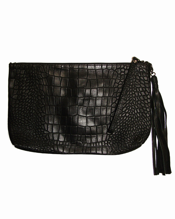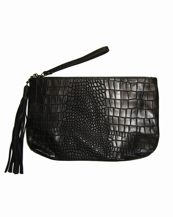 A simple pouch in a beautiful Croco print embossed Matte Black leather. Can be used as a casual clutch or a wristlet makeup/accessories bag! 9.5"x5.5" Zippered closure, wristlet Leather Tassel Made in the USA