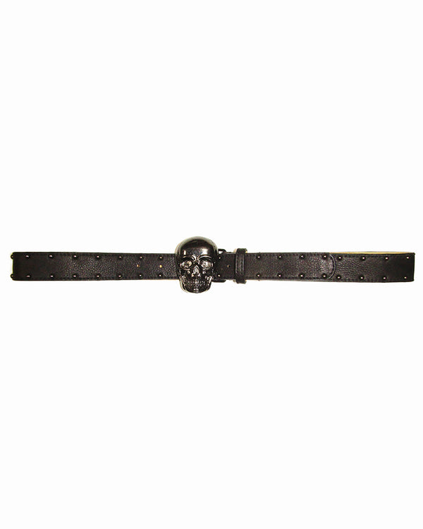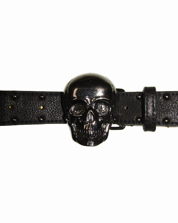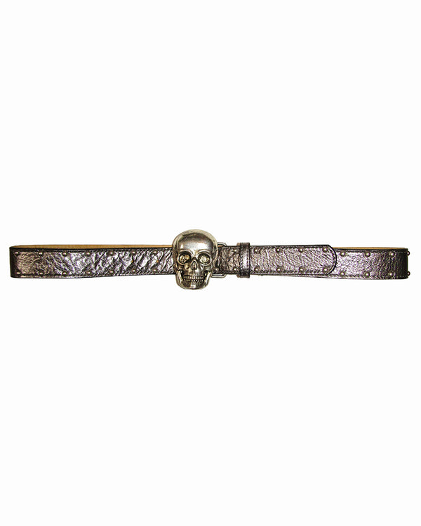 This classic skull belt buckle is placed on a studded strap to give it an extra cool detail. 1.125"W Buckle Measurements: 2.5"x1.75" Silver Metallic Leather with Antiqued Silver hardware Black Matte Leather with Hematite hardware Genuine Leather Made in the...