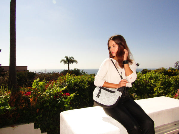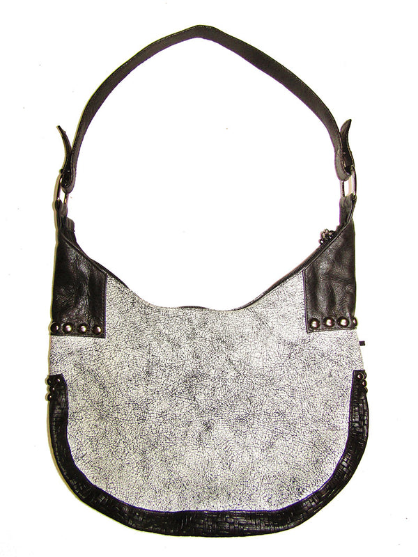A gorgeous early Y2K vintage hobo bag with plenty of pockets! The black leather sides, really highlight the distressed white leather body, finished with gunmetal studs. 10"Lx 13"W, 3" Gusset Strap- .75"W, 16"strap drop Top Zipper closure with leather tassel...