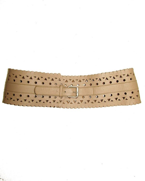 Pulled from our archives, this belt is truly a unique find. The extra-wide style creates a corset silhouette and soft leather is punctuated with small round and triangle-shape punch-out pattern! One of a kind - Vintage sampleS - Sold AS...