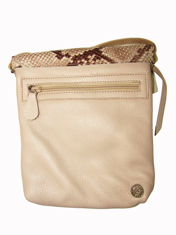 An asymmetrical python-embossed leather flap brings a fun flair to this rectangular crossbody bag in a Taupe Beige leather.